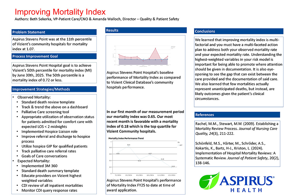 To improve the expected mortality rate, Aspirus implemented 3M’s 360 product to assist with identifying coding opportunities via artificial intelligence. Vizient’s risk models were studied to determine the highest weighted variables. The clinical documentation improvement team queries provide as appropriate to capture these variables. A standard death summary template was developed to assist with documenting the patient’s clinical status to aid coding with capturing higher weighted variables. The team learned that improving mortality index is multi-factorial and must have a multi-faceted action plan to address both observed mortality rate and expected mortality rate. Understanding the highest-weighted variables in the risk model is important for being able to promote where attention should be given in documentation. It is also eye-opening to see the gap that can exist between the care provided and the documentation of said care. They learned that few mortalities represent unanticipated deaths, but instead, they are likely outcomes given the patient’s clinical circumstances.