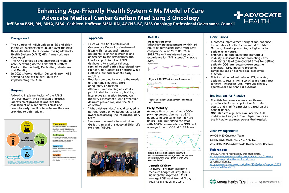 The Age-Friendly Health System (AFHS) offers an evidence-based model of care, centering on the 4Ms: What Matters Most (to the patient), Medication, Mentation, and Mobility. Following implementation of the AFHS 4Ms framework, Aurora Medical Center Grafton’s Med Surg 3 Oncology unit initiated a process improvement project to improve the assessment of What Matters Most and promote early mobility to enhance the care provided to older adults. The process improvement project increased the number of patients evaluated for What Matters most to them. Emphasizing and educating staff about mobility assessment and promoting early mobility led to improved patient mobility metrics. In the end, the initiative reduced the length of stay in the hospital and enabled patients to return home to what matters most to them.