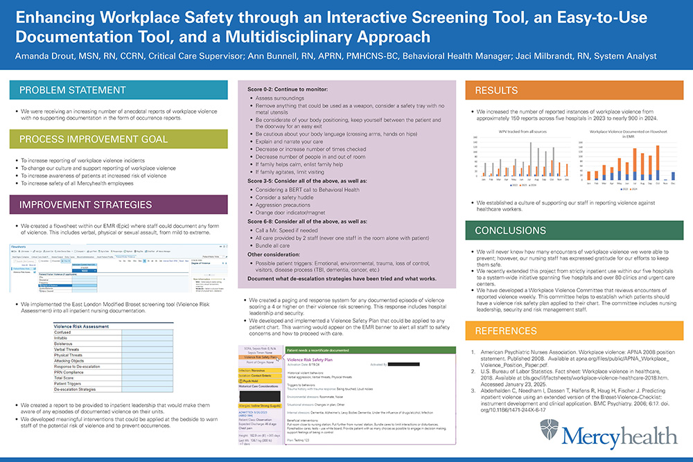 The project focused on increasing awareness of potentially violent patients and ways to communicate those risks to everyone who works with the patient. Through the development of a new flowsheet within the EMR and the adoption of using a violence risk tool to help predict violence, they developed a process to increase real-time reporting to leadership and other work partners. They have been able to make significant improvements in reporting and responding to workplace violence. There were 50 reports of workplace violence among five hospitals in 2023. In 2024 that number increased to nearly 900. There has been culture change within the organization making it safe to report instances of workplace violence and a focus on making the workplace safer.